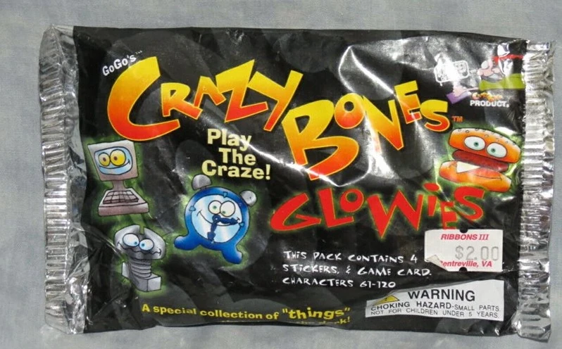 - Each pack includes 4 Crazy Bones, 4 stickers, and 1 Game card with a caption under a picture of the Crazy Bone. Though it was originally assumed that these captions were used to describe the Gogo, it turns out that they are actually the original Spanish names for them (For example, Happy Book = Webster, Goga Cola = Slurp).